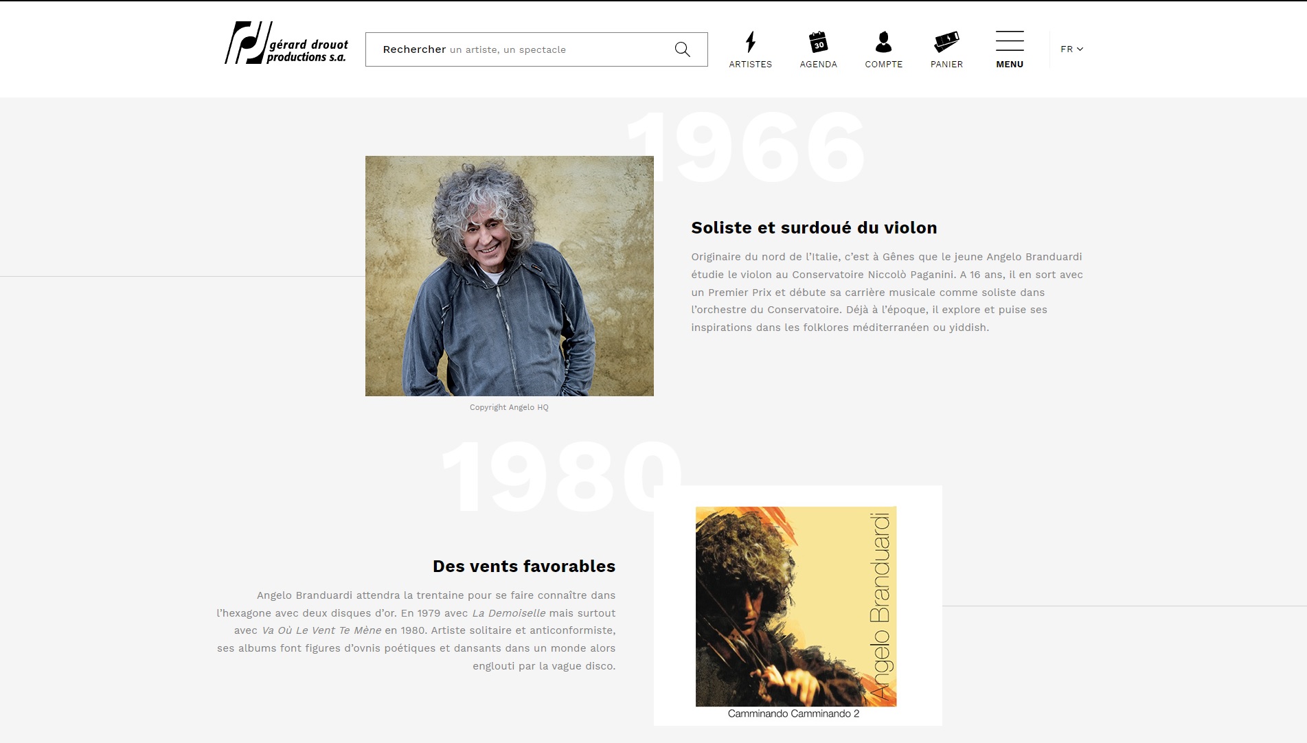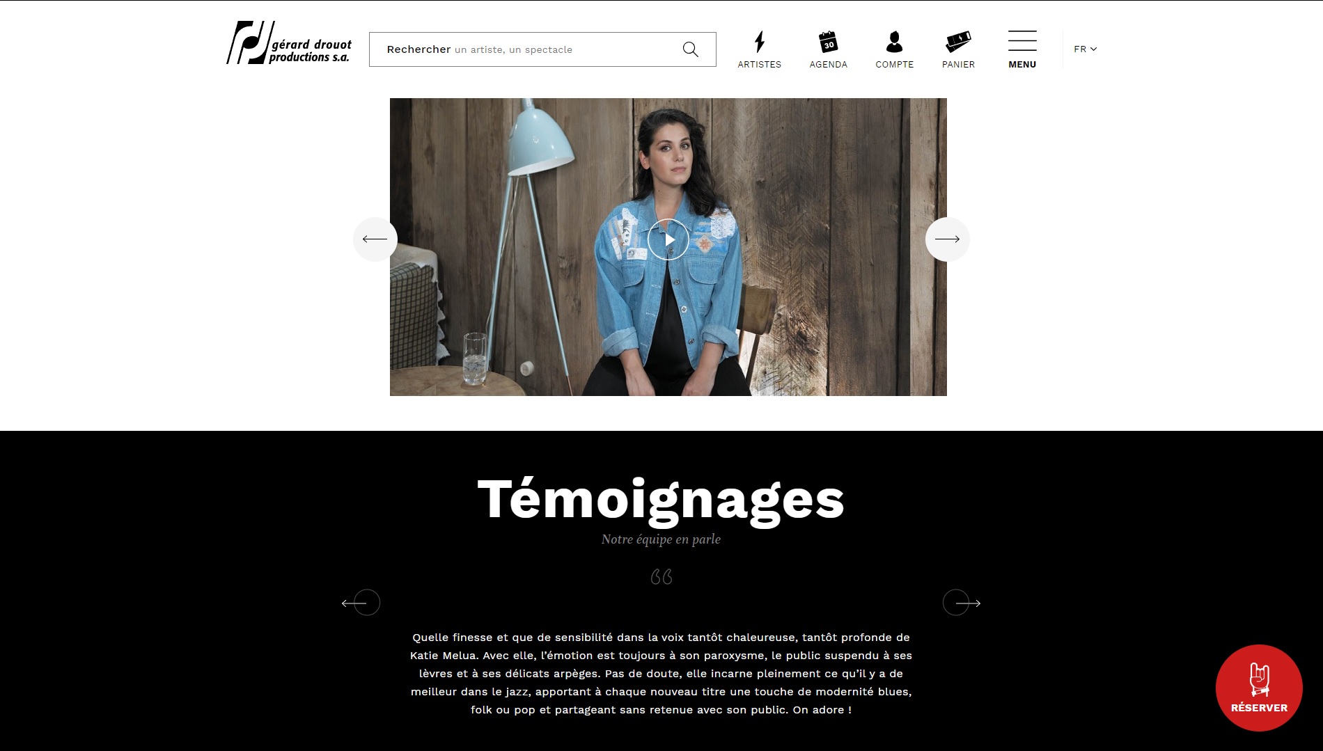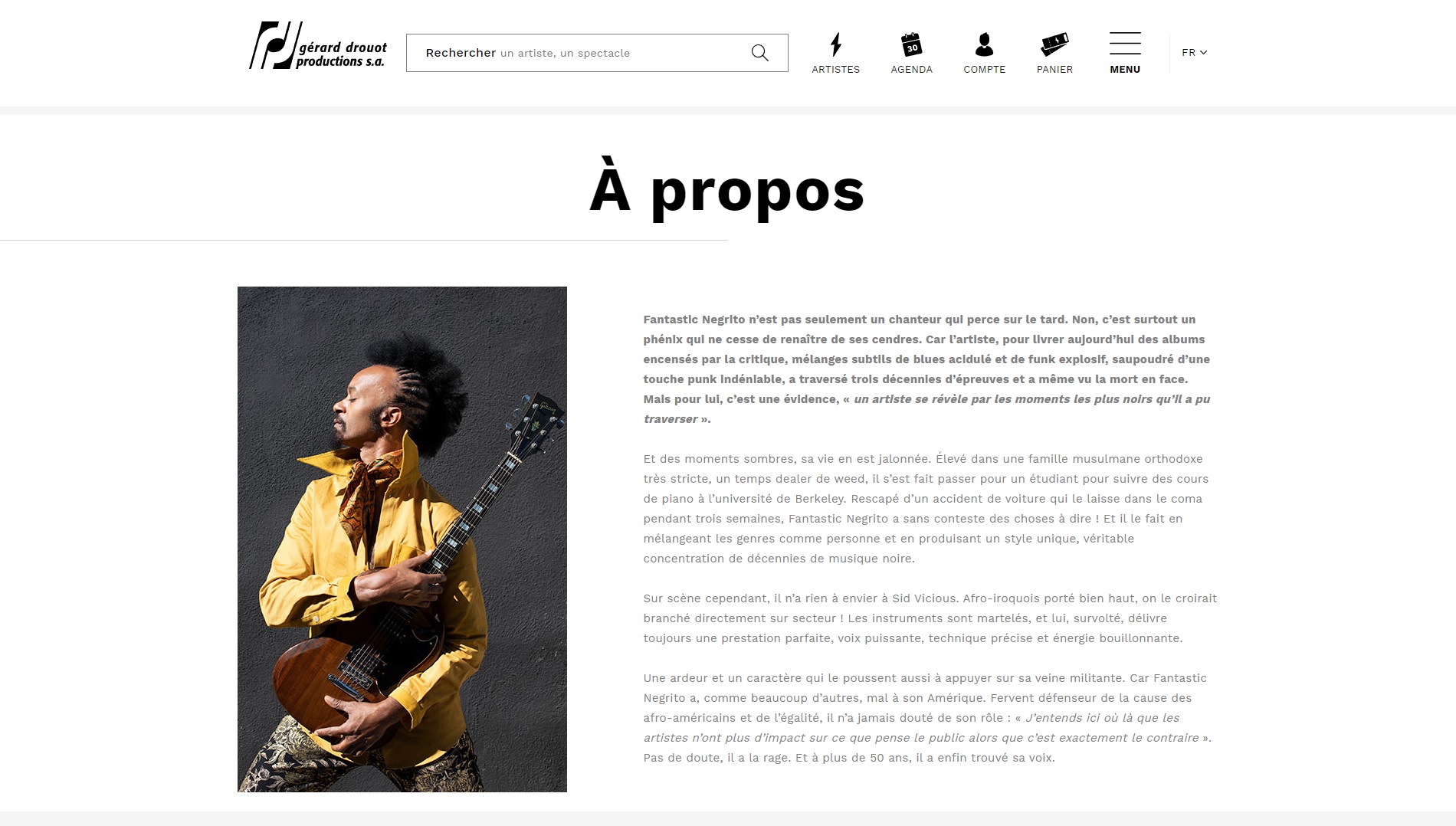Chaque année, Gérard Drouot Productions organise les concerts de plus de 300 artistes. Nous avons choisi d’intégrer pour chacun d’entre eux une fiche qui capture leur identité musicale, reprend leur biographie et intègre de jolis témoignages. Une tonalité énergisée, un champ lexical plein de belles notes, de rock et de douceur et un site internet très bien référencé par les moteurs de recherche.